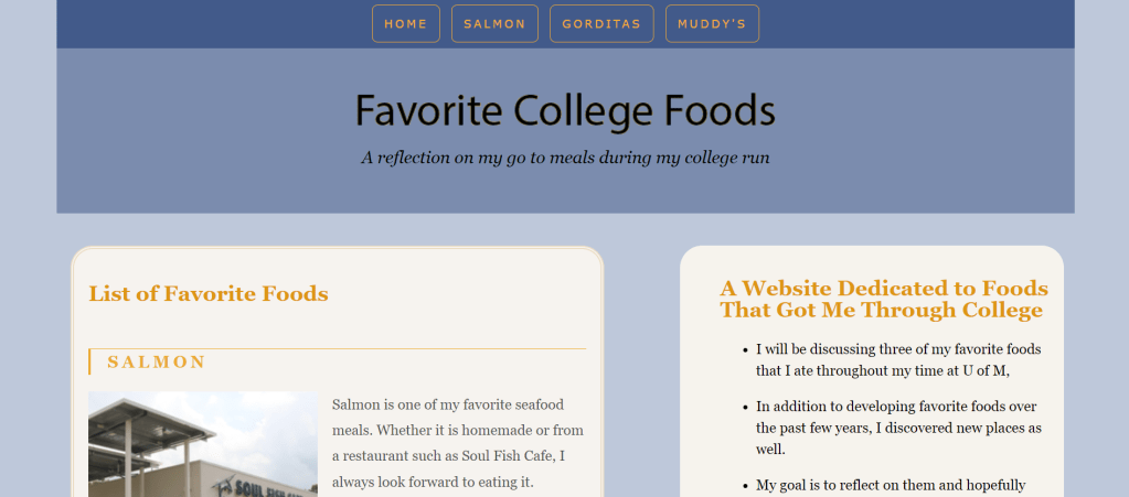 This four-page project, based on my favorite foods I ate during college. listed salmon, gorditas and Muddy’s desserts as my favorites. I did this through using the grid layout technique and flexbox approach to the unordered list for the navigation setup.