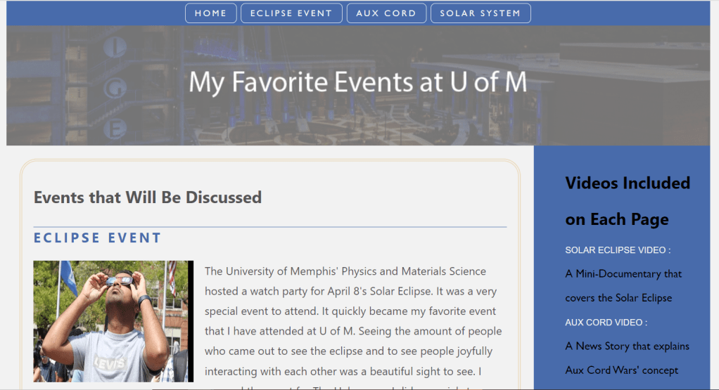 This five-page project, looks at my favorite U of M events that I have been to on campus. I chose the following events: The Solar Eclipse Watch Party, Aux Cord Wars Live and The Voyage Solar System Grand Opening. I did this through using the Responsive Web Design approach for the pages and including a flexbox for the navigation.