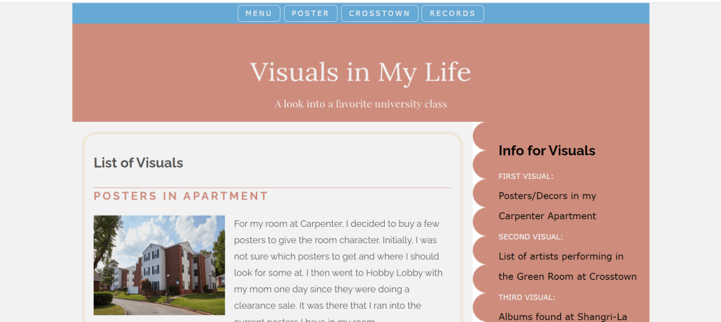 This four-page project, based around the visuals around me. I selected Decors in my college dorm, a poster about music artists performing in Crosstown Concourse’s Green Room. I did this through using the Responsive Web Design approach for the pages and including a flexbox for the navigation.