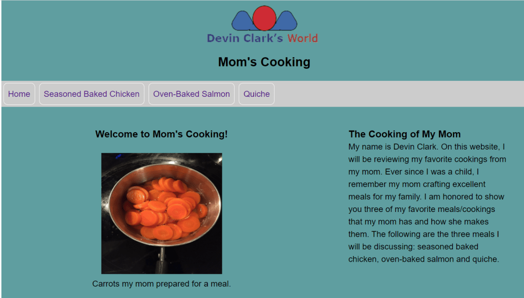 This four-page project, based around food my mom makes, uses a two-column layout method. To do this, I labeled the left column under the id name maincontent and for the right column labeled it under the id name of sidebar. The container of the page took up a width of 80%. The headers and buttons have a width of 100% under its parent, container. I was honored to dedicate this project to my mother, who is an amazing cook and makes delicious meals.