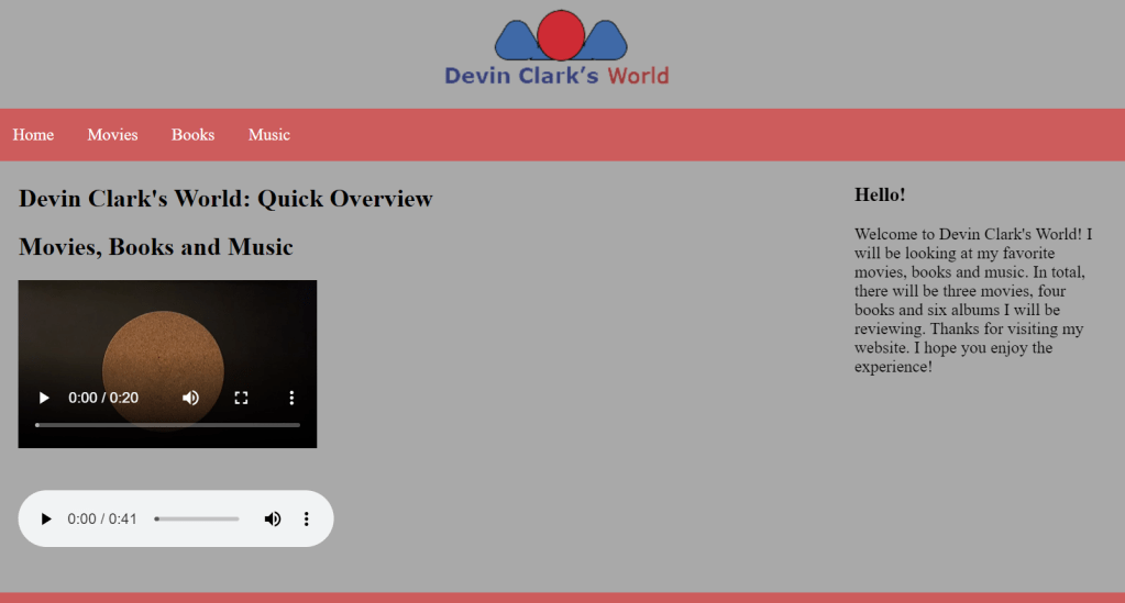 Devin Clark’s World is a four-page project. For CSS, I used a two-column layout through inserting #maincontent and #sidebar. With width of 70% and padding of 2%, the #maincontent section takes up 74% of the page’s space. This leaves the sidebar to take up 26% of space through having a width of 22% and 2% of padding. A video was placed in the maincontent section through using html to insert a video I created. It was fun to present my favorite movies, books and movies to others.