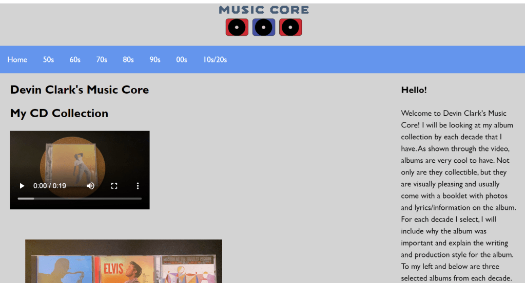 This is my final project for Web Publishing. I used the floating for the home page of this website through labeling my pictures under the div class of “gallery” and the text under it under the div class of “desc.” I inserted the video through using an html insert. Through CSS, I used a two-column layout through using #maincontent and #sidebar. This was an amazing project to work on. I enjoyed being able to talk about my album collection and explaining the history of music along with the importance of CDs.